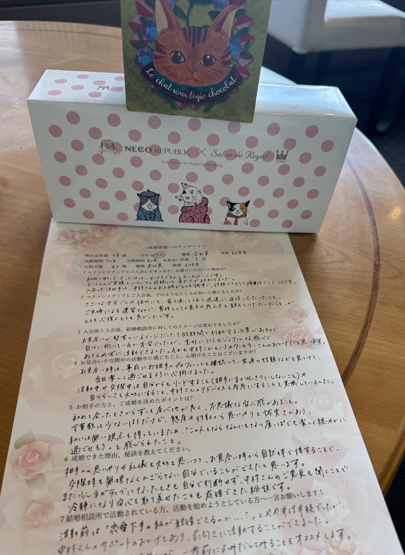 美味しい高価なお菓子に🐈、ご成婚アンケートまで、誠にありがとうございます。
