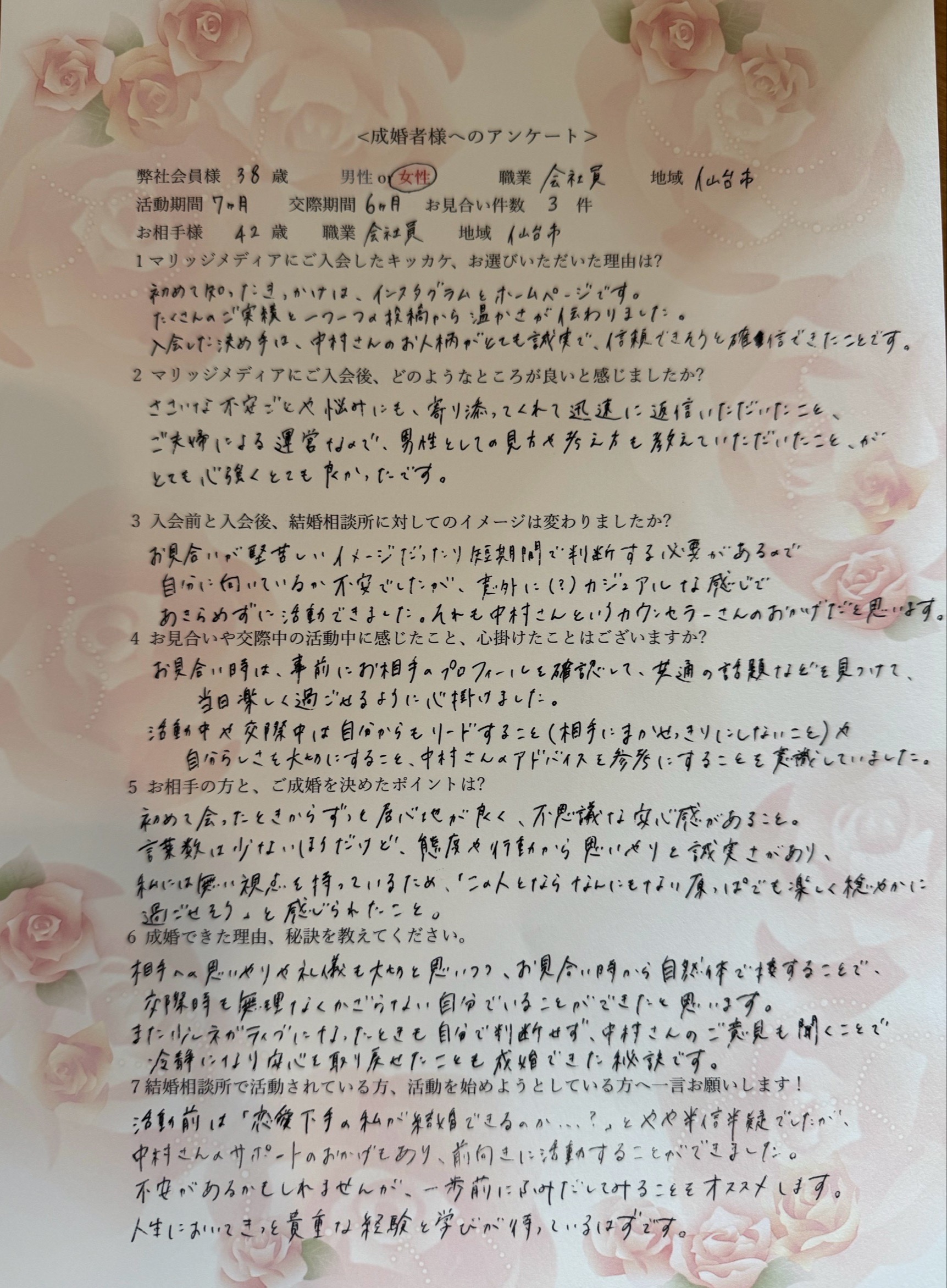 *弊社会員様:38歳女性会員様 職業:会社員 地域:仙台市