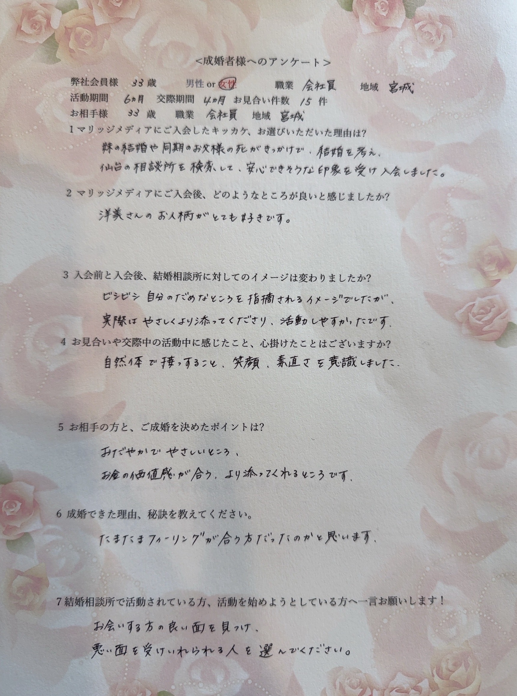 *弊社会員様:33歳女性会員様 職業:会社員 地域:宮城