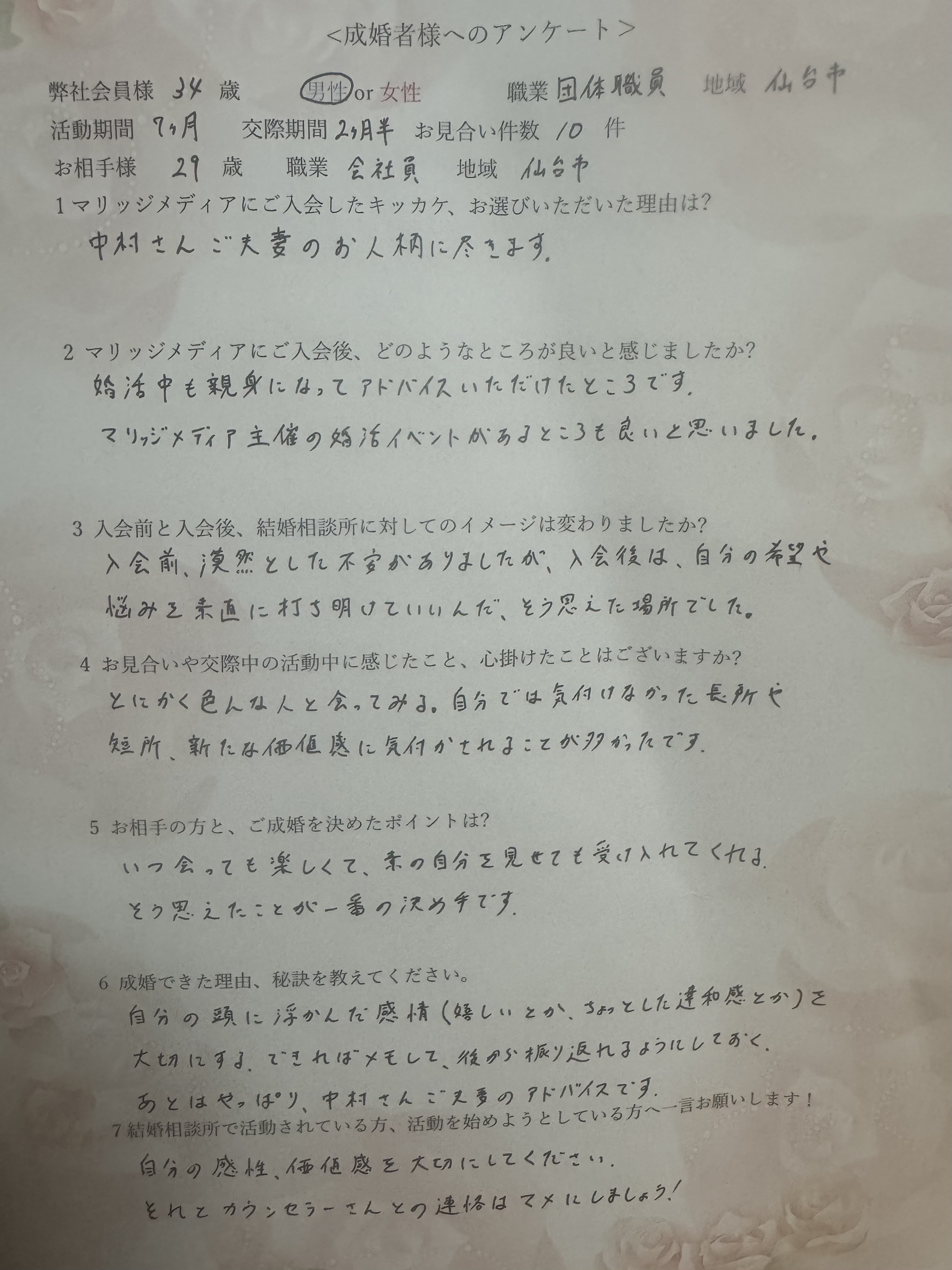 *弊社会員様:34歳男性会員様 職業:団体職員 地域:仙台市